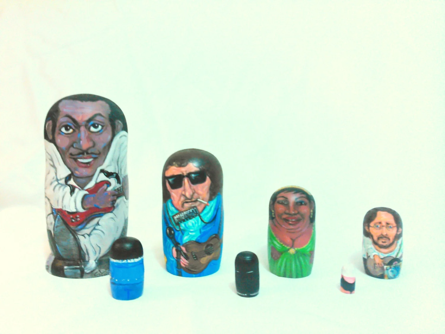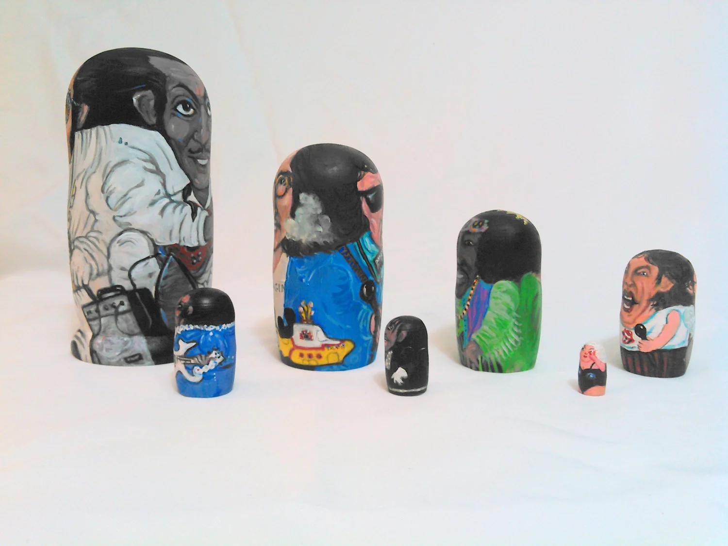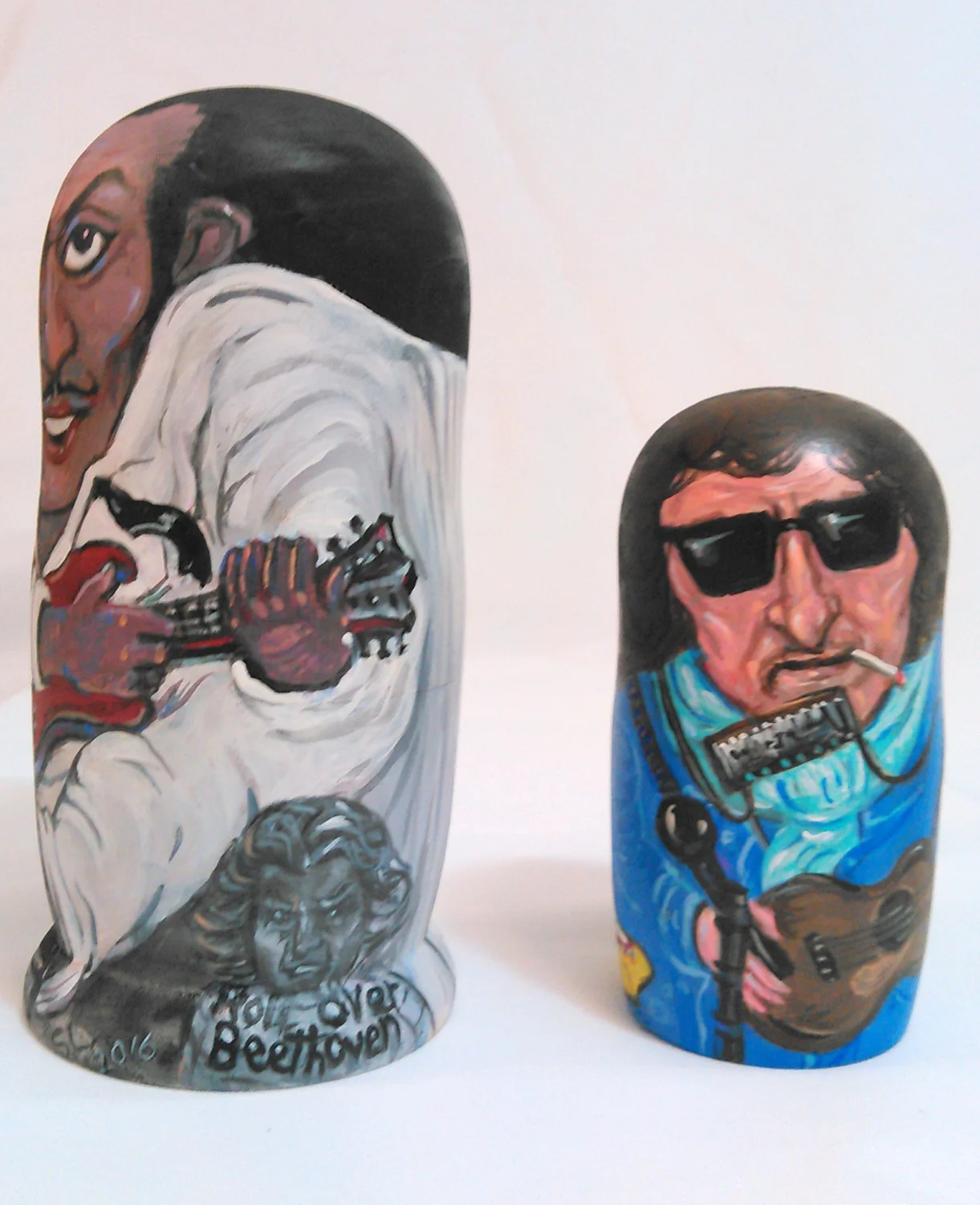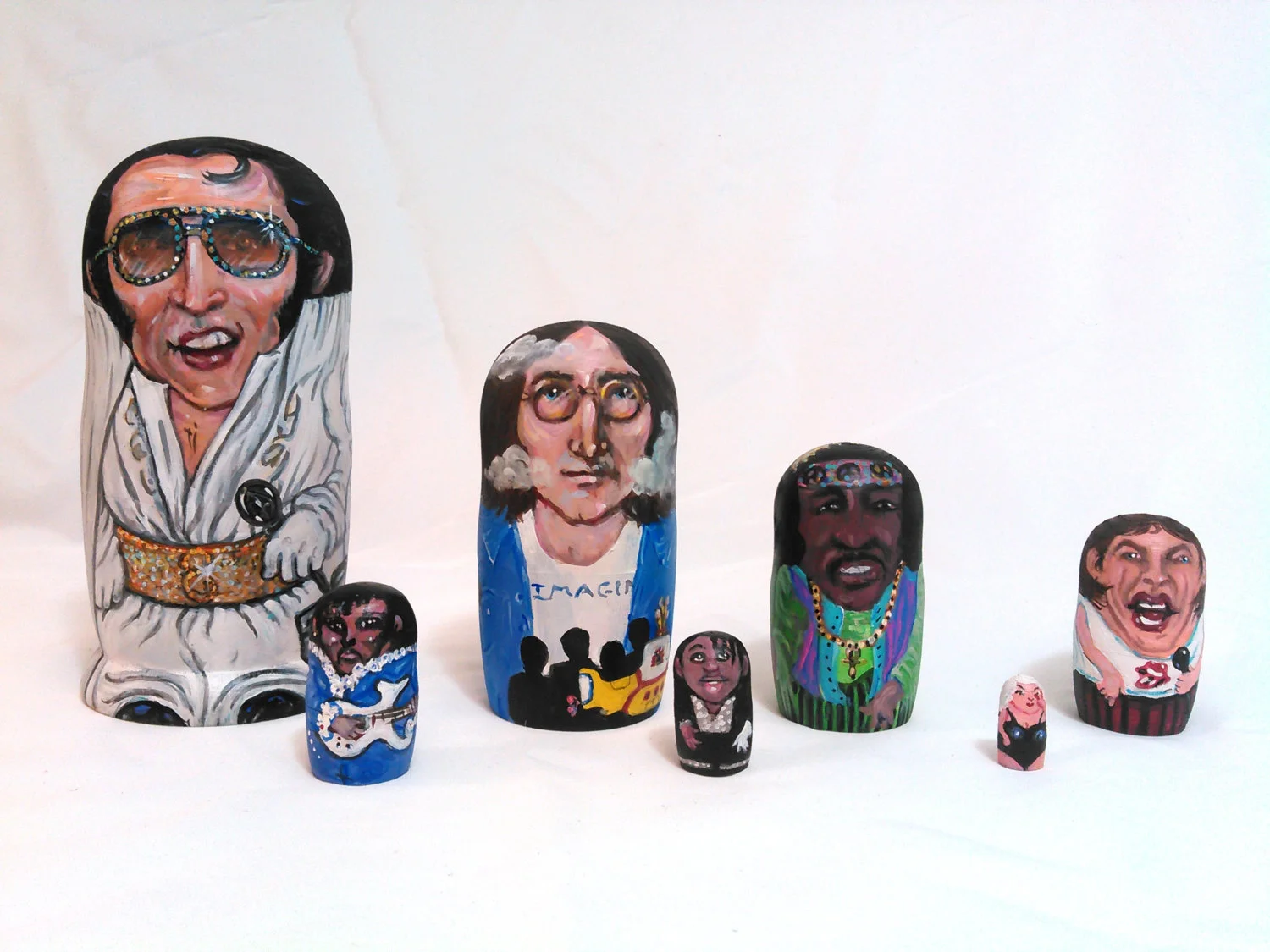 "Roll Over Beethoven" 7 piece two-sided rock and roll legends nesting doll set. 7" by 5" All original, hand-painted. One of a kind.