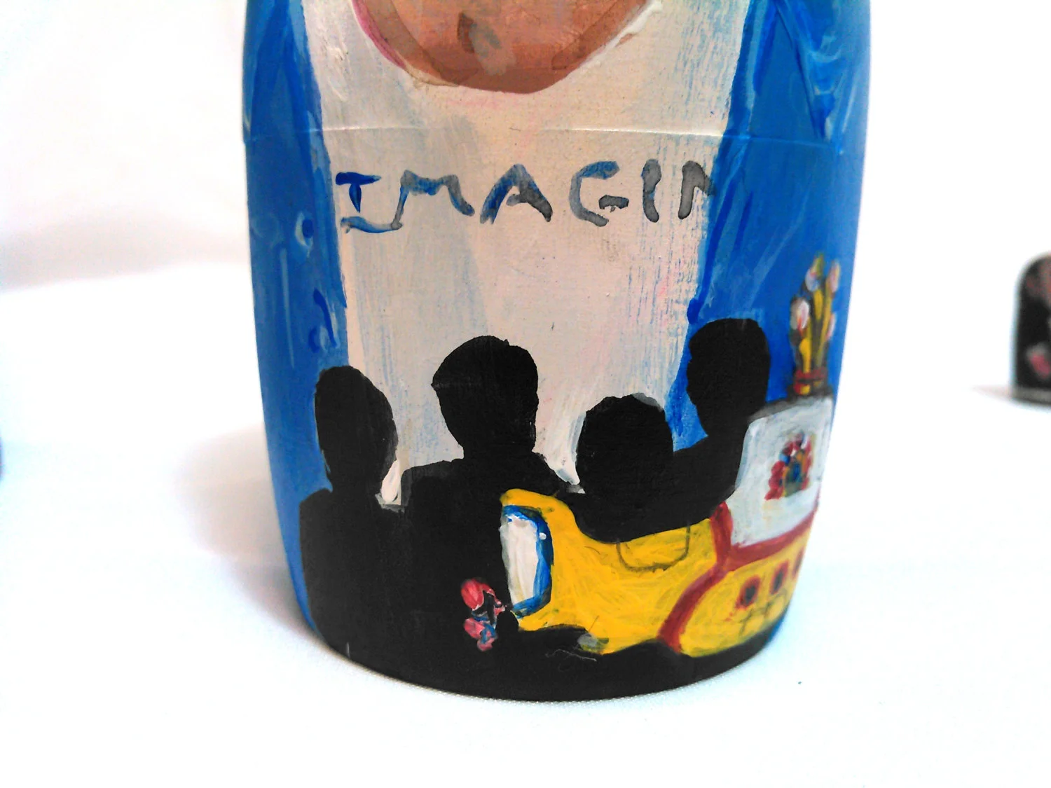 2. Lennon/Dylan. Details include silhouette of The Beatles, a Yellow Submarine, Imagine album cover homage.